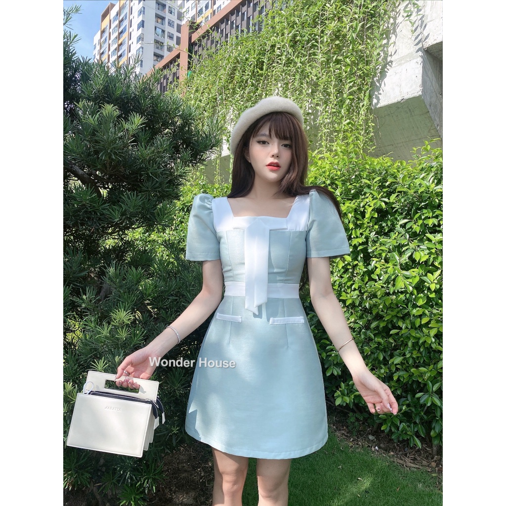 Giới thiệu Đầm thiết kế WONDERHOUSE cổ vuông phối nơ nhỏ dự tiệc,dạo phố chất liệu lenin dày dặn sang chảnh - Couple Dress