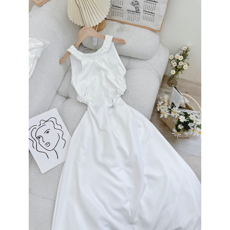 Giới thiệu Đầm trắng sát nách xoắn eo dáng maxi xoè dài khoét sau