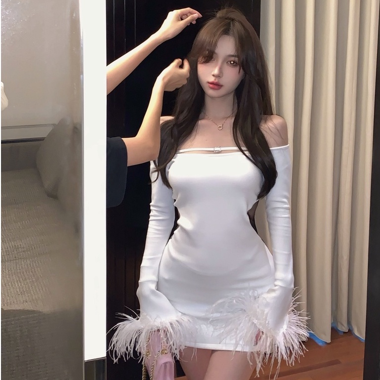 Giới thiệu Đầm Trắng Tay Dài Ôm Dáng Co Giãn Đính Lông Vũ Thời Trang Mùa Thu Hàn Quốc Gợi Cảm Cho Nữ