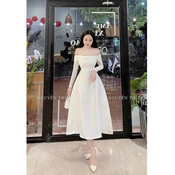 Giới thiệu Đầm váy nữ dáng xòe trễ vai với 3 tone màu nổi bật dành cho các nàng diện đi đám cưới, đi chơi Noel, Tết GS010