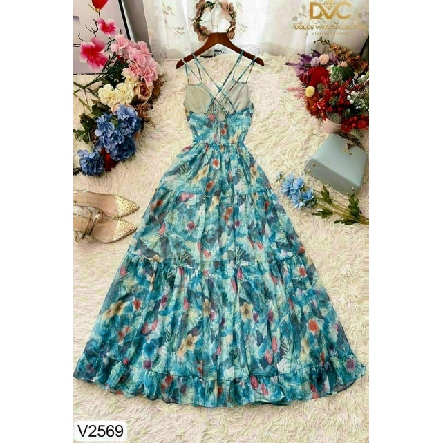 Giới thiệu Đầm váy nữ maxi 2 dây với màu xanh họa tiết xinh xắn, bồng bềnh thích hợp cho các nàng mang đi du lịch, đi biển