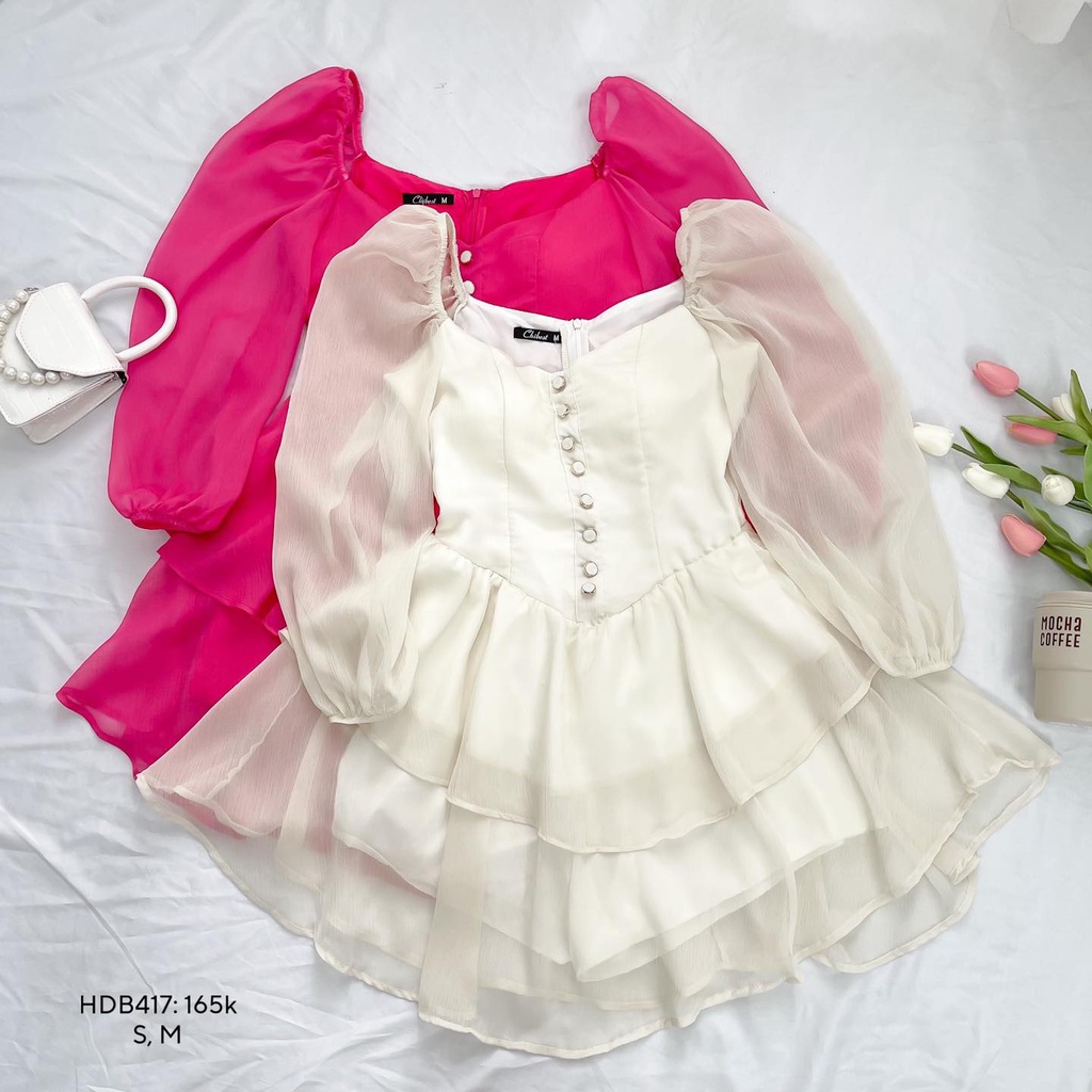 Giới thiệu Đầm voan gân tiểu thư 2 tầng dài tay bồng nút giữa CHIBEST HDB417