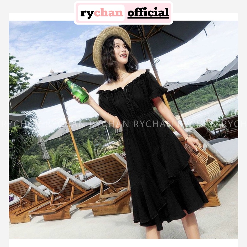 Giới thiệu Đầm Xòe Đi Biển Midi Đen Trễ Vai Viền Bèo 3 Màu Đen Đỏ Vàng - DX0060