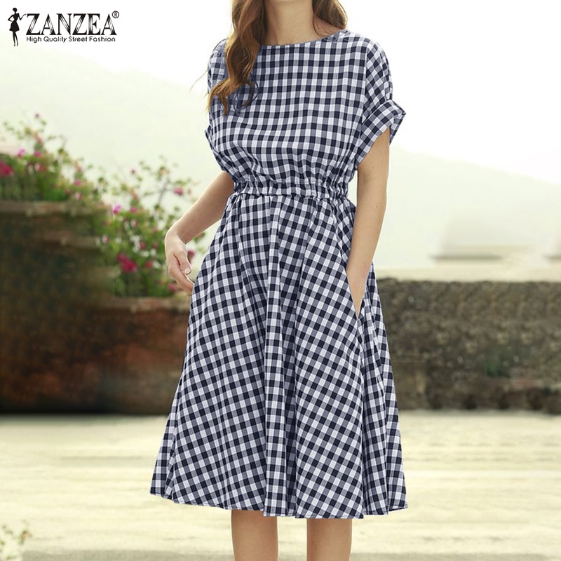 Giới thiệu Đầm xòe ZANZEA ngắn tay kẻ sọc caro thời trang cho nữ