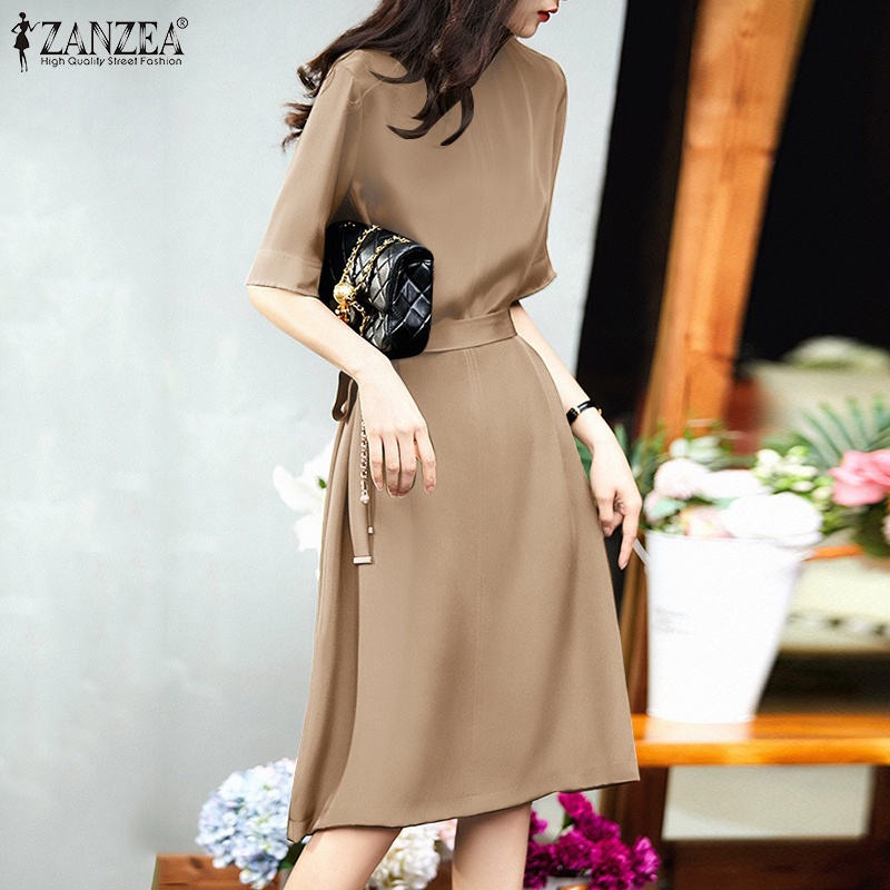 Giới thiệu Đầm ZANZEA cổ tròn tay lửng eo vừa vải satin thời trang thanh lịch tùy chọn màu sắc dành cho nữ