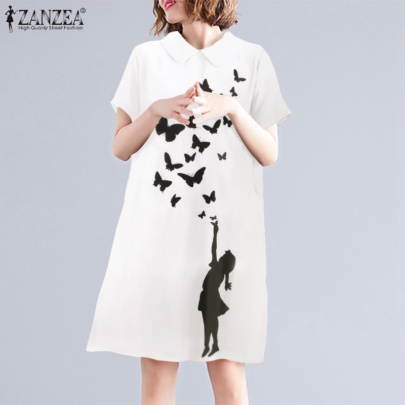 Giới thiệu Đầm ZANZEA midi tay ngắn cổ búp bê in họa tiết bướm phong cách đường phố thời trang cho nữ