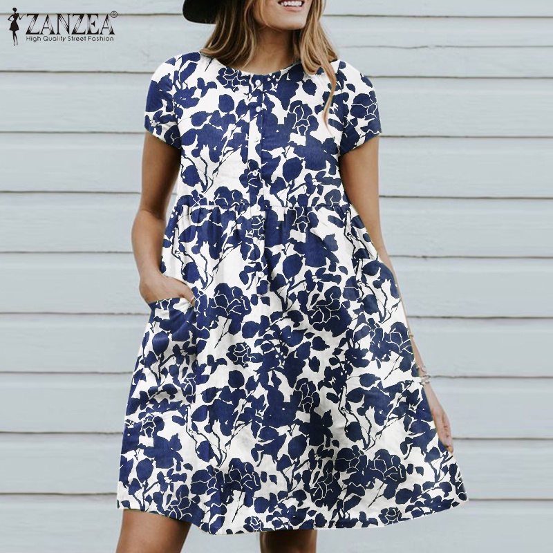 Giới thiệu Đầm ZANZEA vải cotton ngắn tay có túi in họa tiết thời trang phong cách châu Âu cho nữ