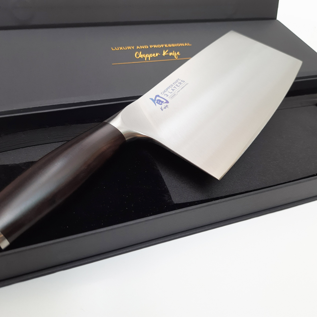 Dao Chặt Cao Cấp Thép 440C High Carbon Kaiyo - Thương hiêu: KAIYO - Vật liệu: Thép không gỉ cao cấp - Thông số kỹ thuật: Dài tổng: 32,2 cm/ Cán: 11,9 cm/ Rộng: 9,5 cm/Dầy: 2,6 mm/ Trọng lượng dao (Net): 488gr - Dao chặt cao cấp thép 440C High carbon được làm từ thép không gỉ 440C 3 lớp có độ cứng cao, vượt trội so với tất cả các loại thép không gỉ khác, có thể chặt ngọt tất cả các loại thực phẩm (xương sườn, gia cầm ….) mà không sợ bị mẻ lưỡi dao. - Dao sử dụng thép 440C có hàm lượng crom và cacbon lớn nên có khả năng chống ăn mòn rất cao, chống oxy hoá cao, chống mài mòn tốt, độ bền lâu dài. - Thiết kế với độ nặng và kích thước vừa vặn, cán dao được làm bằng gỗ mun chắc chắn, tất cả tạo sự cân bằng khi thao tác. - Hộp đựng sang trọng, đẳng cấp - Hàng Nhập Khẩu Nhật sản xuất Trung Quốc