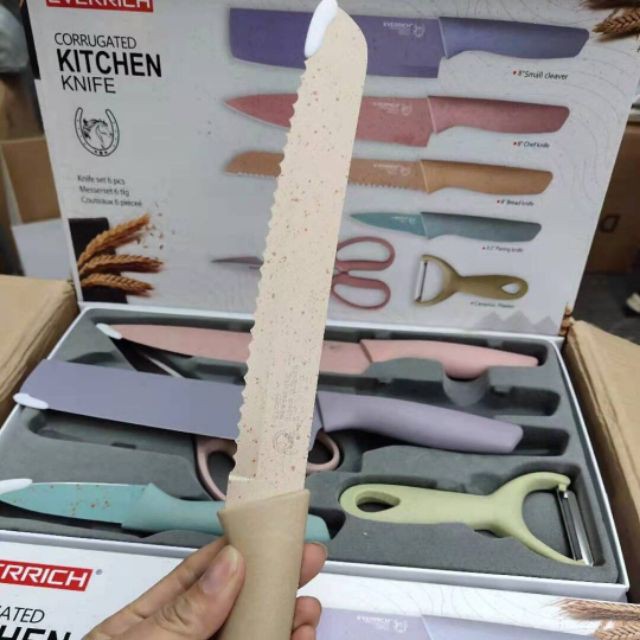 bộ 6 món : 4dao 1 kéo 1 nạo, kích thước như ảnh Bộ dao kháng khuẩn lõi thép không gỉ phủ lớp chống gỉ chống vi khuẩn bên ngoài Hãng everrich #bodaokeo hotline: 0915044358