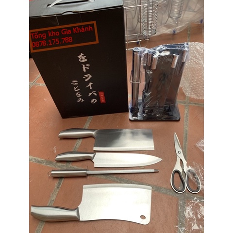 Bộ Dao Nhật 6 món, Dao Chặt Seki Japan Inox Cao Cấp ====================================== – Bộ dao inox 6 món Nhật Bản được làm bằng inox bền đẹp, cứng chắc, dễ dàng chùi rửa khi bị bám bẩn. Chất liệu chống gỉ sét, chống ăn mòn, không chứa thành phần độc hại và không tương tác hóa học với thực phẩm, đảm bảo an toàn cho sức khỏe. – Lưỡi dao đúc liền với cán dao tạo nên sự liền khối, chắc chắn. Phần tay cầm được thiết kế vừa vặn, chắc tay, tránh trơn trượt khi sử dụng, giúp bạn thao tác dễ dàng, linh hoạt và an toàn. – Cán kéo có gắn miếng đệm giúp bạn không bị đau tay khi phải cầm kéo lâu. – Đế cắm có khả năng chịu lực tốt, các vị trí cắm được phân chia rõ ràng giúp bạn sắp xếp dao kéo ngay ngắn, gọn gàng, không bị xáo trộn hay va chạm nên tránh được việc bị trầy xước, sứt mẻ dao. – Phần lưỡi dao nằm trọn trong ngăn cắm, đảm bảo an toàn cho các thành viên trong gia đình, nhất là những gia đình có trẻ nhỏ. – Được sản xuất theo công nghệ tiên tiến, sở hữu thiết kế đơn giản với màu bạc sáng bóng, không chỉ hỗ trợ tối đa cho công việc bếp núc mà còn góp phần mang đến vẻ trang nhã, hiện đại cho không gian bếp nhà bạn. Xuất xứ : Trung Quốc Thông số kỹ thuật; Bộ dao inox 6 món Nhật Bản bao gồm ✔ 1 dao lớn thái thịt, chặt gà dài 31 cm, lưỡi dài 18 cm ✔ 1 dao thái, gọt trái cây, rau củ quả dài 25 cm, lưỡi dài 12.5 cm ✔ 1 dao gọt trái cây dài 21 cm, lưỡi dài 10.5 cm ✔ 1 kéo dài 18.4 cm, lưỡi dài 11.5 cm ✔ 1 thanh mài dao dài 30 cm, lưỡi dài 19 cm ✔ 1 đế để dao có thể để đứng hoặc để nghiêng