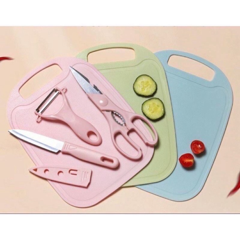 CẤU TẠO SẢN PHẨM - Bộ dao thớt gồm: 1 thớt, 1 dao, 1 kéo và 1 nạo - Trọng lượng 300g - Kích thước 25 x 18 (cm) - Chất liệu nhựa bền bỉ và dẻo dai, dễ lau chùi, giảm sự phát triển của vi khuẩn - Lưỡi dao bằng thép không gỉ sắc bén, cho vết cắt đẹp, chính xác và dễ dàng