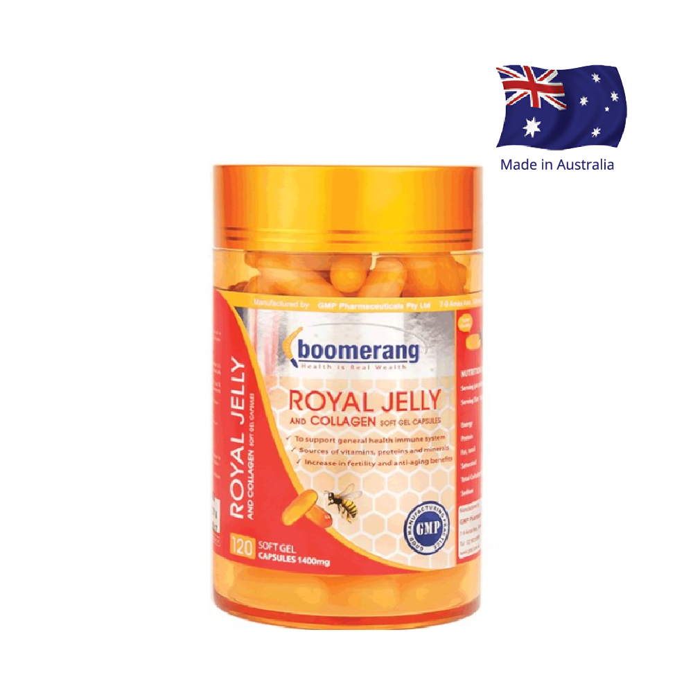 Viên uống sữa ong chúa Royal Collagen Boomerang Úc là sản phẩm kết hợp hoàn hảo giữa sữa ong chúa và collagen do Tập đoàn dược phẩm GMP hàng đầu của Australia sản xuất.Boomerang Royal Jelly and Collagen dùng để hỗ trợ sức khỏe và làm đẹp da. Royal Jelly chứa các chất dinh dưỡng như Gelatin, Nucleic Acids, RNA và DNA và 22 Amino acids cần thiết cho hoạt động của cơ thể, B1, B2 (riboflavin), liacin, B5 (pantothenic acid), B6, Biotin, folic acid, B12, inositol, và choline.