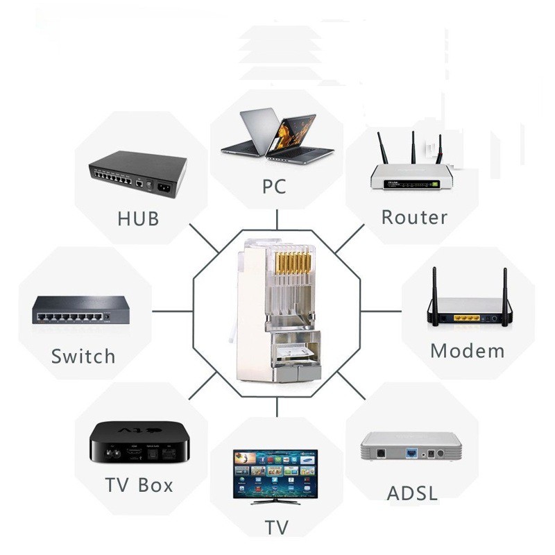 1 túi 10 cái. Tính năng: Đầu bấm dây mạng RJ45 Tương thích: RJ45 cat6, cat6e Chất liệu: Chân bấm đồng nguyên chất, mạ vàng 24K Vỏ nhựa trong cao cấp chống gãy, vỡ • Đầu bấm mạng RJ45 cat6 cao cấp Ugreen được sản xuất bằng chất liệu cao cấp bao gồm các chân bấm bằng đồng nguyên chất mạ vàng 24K (lớp mạ dầy 50 micro met) và chất liệu nhựa bọc inox cao cấp giúp đảm bảo khả năng dẫn truyền tín hiệu của các sợi cáp mạng cat6, cat6e. • Đầu bấm mạng RJ45 loại tốt Ugreen 20333 bao gồm 1 hộp chứa 10 hạt mạng cao cấp bên trong, tương thích với tất cả các loại cáp mạng cat6, cat6e hiện nay. Với chất liệu cao cấp, hạt mạng ugreen hạn chế tình trạng bị vỡ, gãy trong quá trình bấm dây giúp giảm thiểu tiêu hao tối đa cho các dự án và công trình.