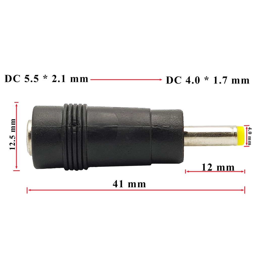 🔴🔴 THÔNG SỐ KĨ THUẬT 🔹Mục đích: Chuyển đầu DC 5.5x2.1mm đực sang đầu DC 4.0x1.7mm đực 🔹- Kiểu: Thẳng 🔹- Chất liệu: Nhựa + Kim loại 🔹- Màu sắc: Đen 🔹- Trọng lượng: 5g 🔹- Kích thước tổng quát:41x12.5 mm (dài x đường kính)