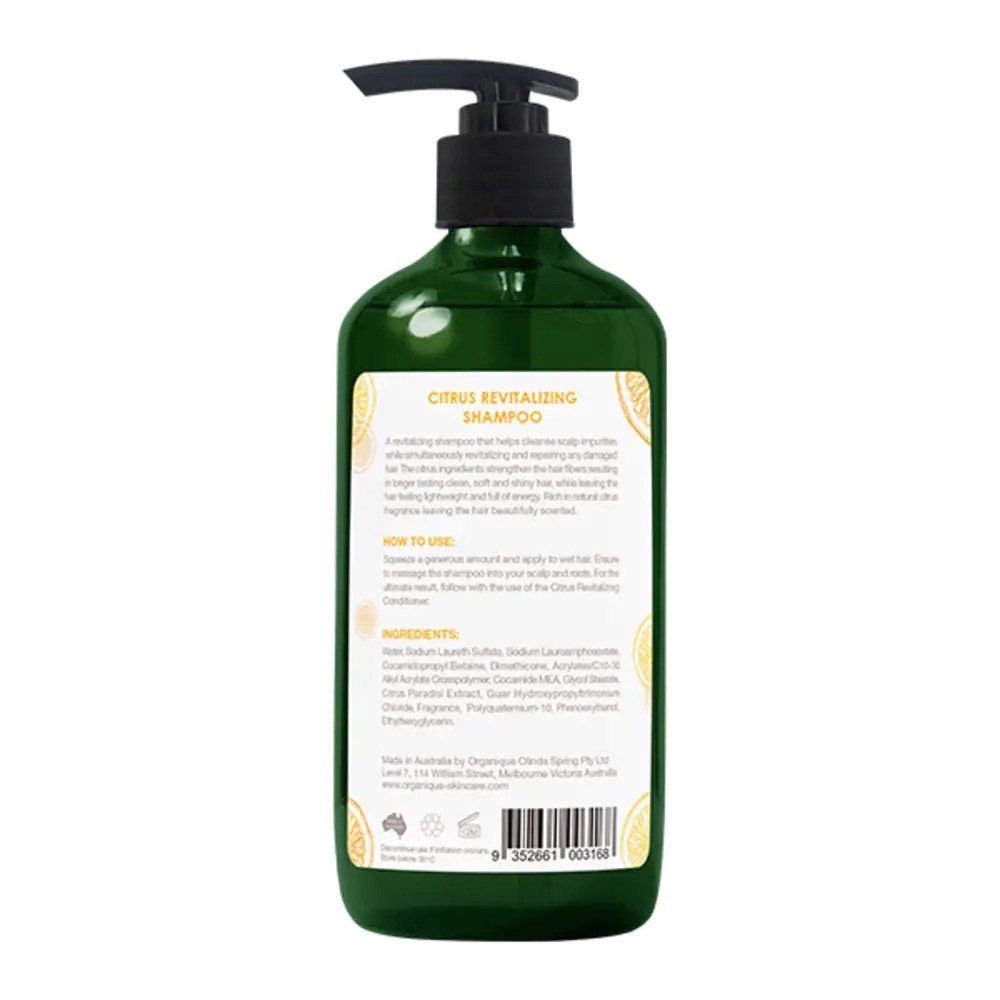 Dầu Gội Organique Phục Hồi Hương Cam Chanh Citrus Revitalizing Shampoo giàu tinh chất thảo mộc và hương cam quất tự nhiên giúp làm sạch da dầu đồng thời phục hồi và nuôi dưỡng tóc bị hư tổn. Tinh chất cam quất giúp tóc sạch lâu hơn, mùi hương ngọt ngào sảng khoái.