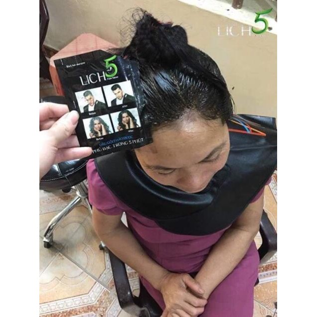 LICH 5 – Dầu gội đen tóc thảo dược thay thế hoàn toàn cho thuốc nhuộm, rất an toàn và lành tính. Tóc bạn được bảo vệ và nuôi dưỡng trong suốt quá trình gội, đem lại hiệu quả phủ bạc 100%. Giúp mái tóc trở nên đen mượt chỉ sau 5 phút gội. Sản xuất theo công nghệ của Đức và có mặt trên 10 quốc egia trên thế giới Dầu gội nhuộm tóc thảo dược Lich5 không chứa Amoniac và PPD độc hại. Phủ bạc tóc hiệu quả, không gây kích ứng da. Không làm cho tóc bị khô, xơ, xốp, rụng hay chẻ ngọn 1 hộp 10 gói sử dụng được 10 lần - vừa tiện lợi vừa tiết kiệm vừa an toàn tuyệt đối ạ