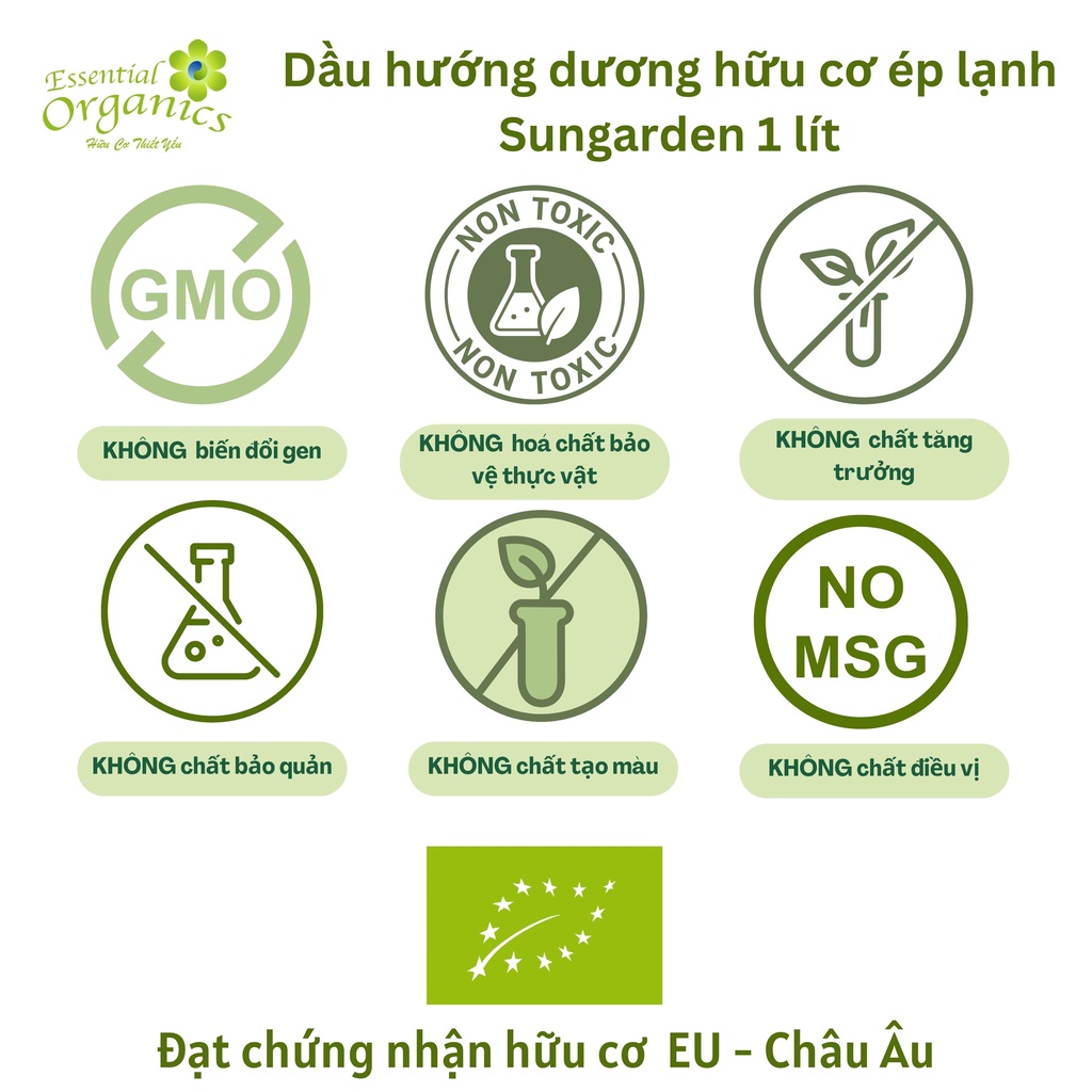 1. THÔNG TIN CHUNG - Sản phẩm: Dầu hướng dương ép lạnh hữu cơ Sungarden 1L, dầu hướng dương hữu cơ, dầu nấu ăn từ hướng dương - Thương hiệu: Sungarden - Xuất xứ: : Slovakia - Trọng lượng/thể tích: 1L - Đạt chứng nhận hữu cơ: EU Châu Âu - Đối tượng: Người lớn và trẻ em từ 6 tháng tuổi