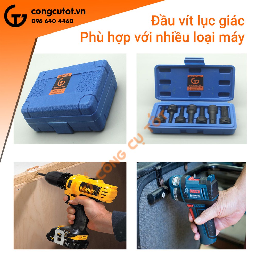 Đầu vặn vít lục giác gắn súng bắn ốc 3/8" làm từ thép Cr-MO có 6 đầu vít với các kích thước đa dạng từ H4 - H12. Phụ kiện này kết hợp với súng bắn ốc, máy bắt vít đã trở thành "cặp đôi hoàn hảo" không thể thiếu trong công việc sửa chữa, lắp ráp, bảo trì,...máy móc, thiết bị, vật dụng. Sản phẩm có cấu tạo tiên tiến, dễ dàng sử dụng, thích hợp cho cả những người thợ lành nghề và thợ không chuyên.
