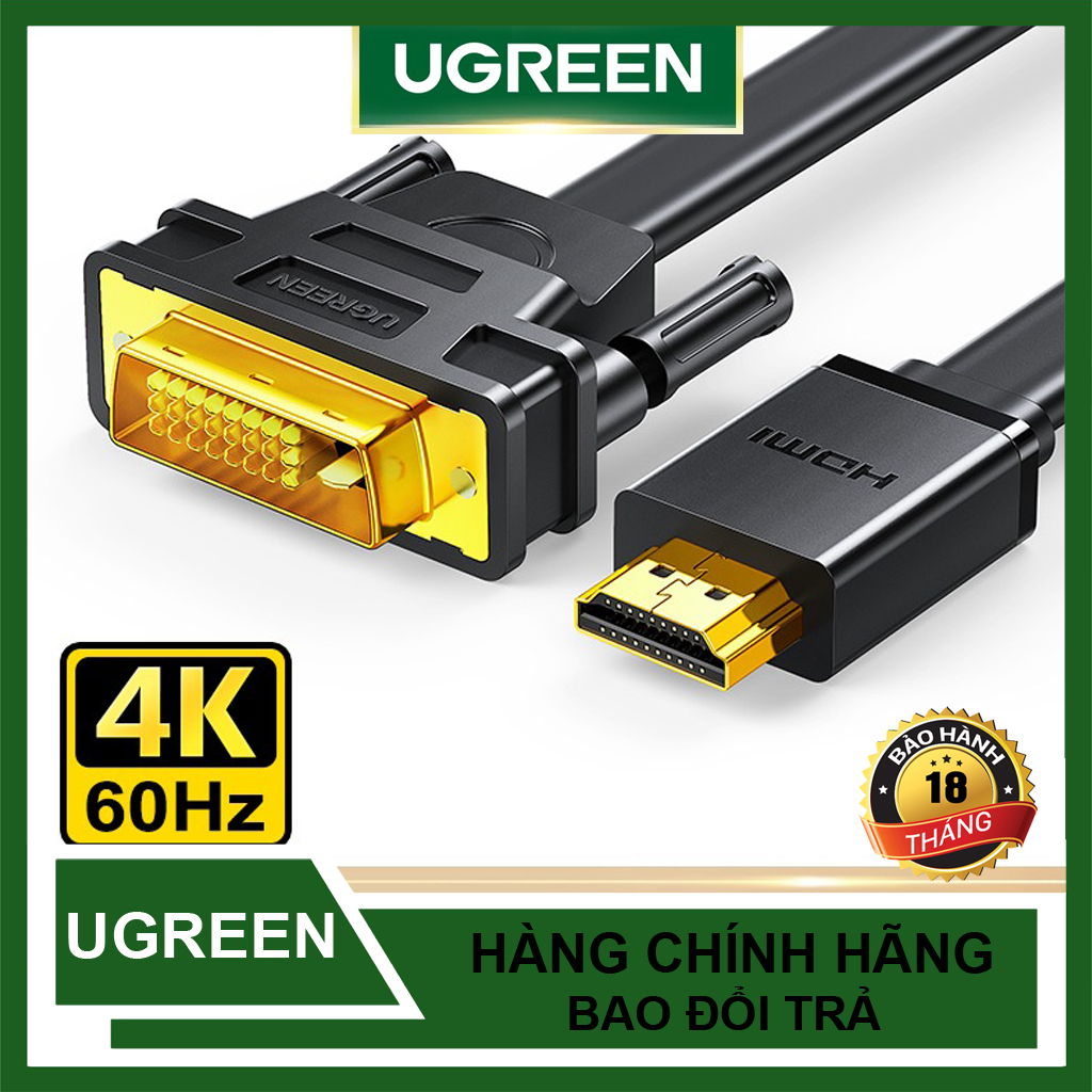 Thông Số Kỹ Thuật Dây Chuyển HDMI ra DVI Và Chuyển Ngược Lại Chính Hãng UGREEN HD106 Cao Cấp - Thương hiệu: UGREEN - Danh Mục : HDMI Cable - Model: HD106 - Input: HDMI Male - Output: DVI Male - Tương thích với hầu hết các thiết bị Mac OS/Windows/Linux có hỗ trợ cổng HDMI; cắm là nhận, không cần cài đặt Driver. - Jack cắm được mạ vàng 24K, cho chất lượng kết nối tín hiệu vượt trội. - Vỏ cáp làm bằng nhựa PVC thân thiện môi trường với độ đàn hồi cao, dễ dàng uốn dẻo mà không lo gãy cáp. - Lõi là từ những sợi đồng nguyên chất, được bọc lưới chống nhiễu cao cấp giúp giảm suy hao tín hiệu và chống nhiễu tối đa.