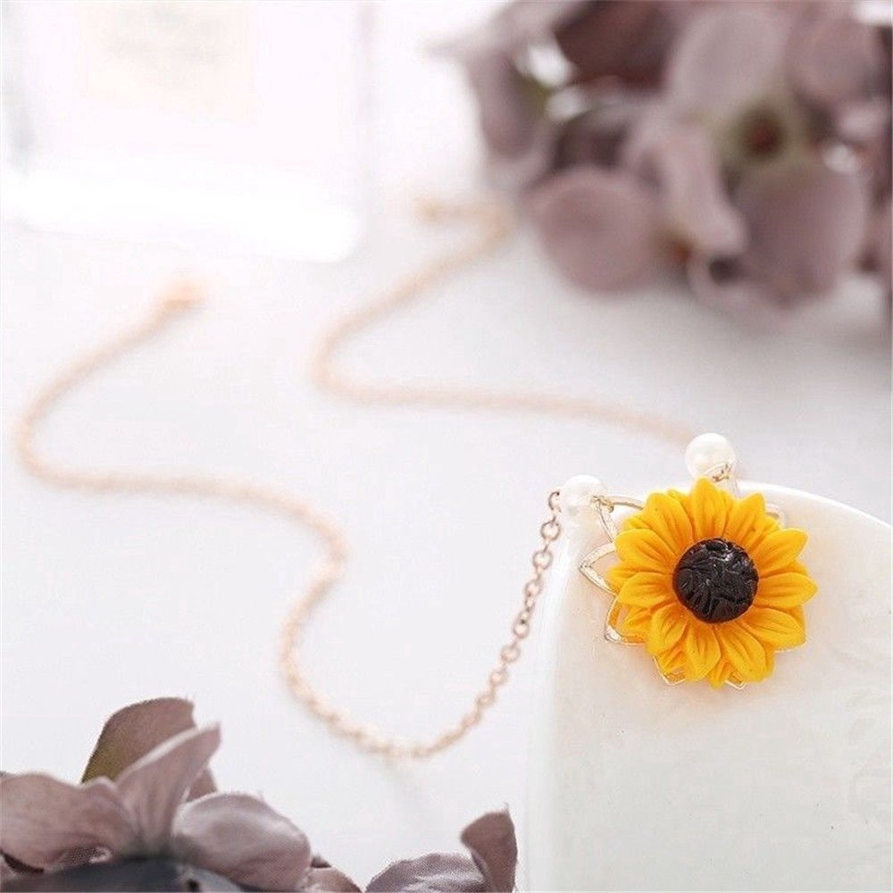 Mô tả: 1. Màu sắc: 3 màu tùy chọn 2. Trọng lượng: 7g 3. Kích thước: Tổng chiều dài: 55cm Mở rộng dây: 5.5cm Đường kính hoa hướng dương: 0.8cm Đường kính ngọc trai: 0.5cm 4. Chất liệu: Hợp kim