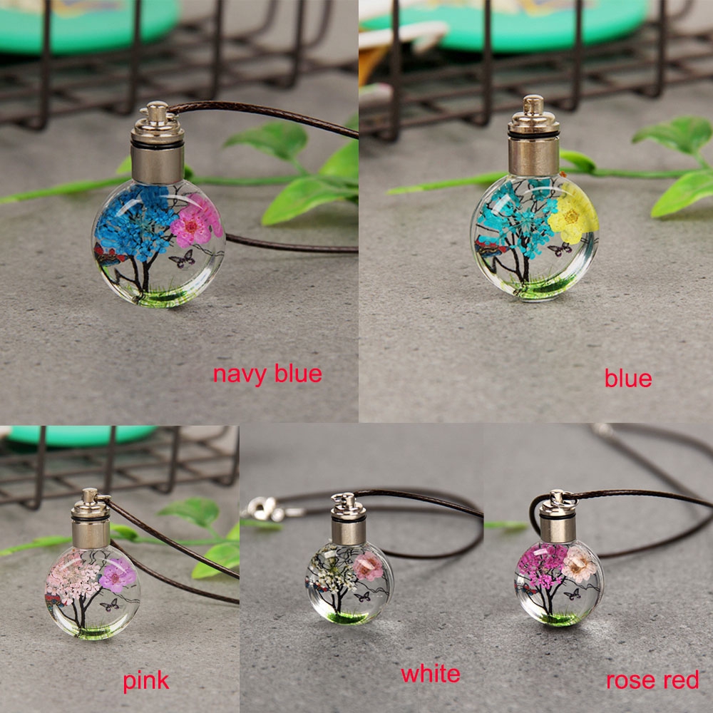 Material:Alloy,Dried Flower,GlassColor:White,Blue,Navy Blue,Pink,Rose red,Necklace Type:Pendant NecklaceGender:WomenPackage include: 1 pc necklaceSize:2.4cm