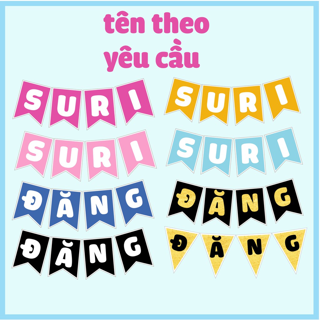 Dây cờ chữ cái ghép tên bé được thiết kế in bằng giấy bìa cứng, dày dặn Dây cờ chữ cái ghép tên bé có 2 dạng: đuôi cá và tam giác Màu sắc: có nhiều màu cho cả bé trai, bé gái và người lớn Giá tiền cho 1 lá cờ (1 chữ cái)