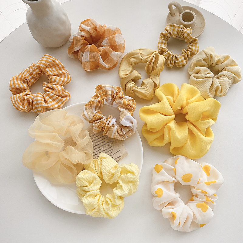 Tên sản phẩm: Dây cột tóc màu vàng Chất liệu: Vải Phong cách: Nhật Bản và Hàn Quốc Tình trạng sản phẩm: Mới Phân loại phụ kiện tóc: Dây cột tóc