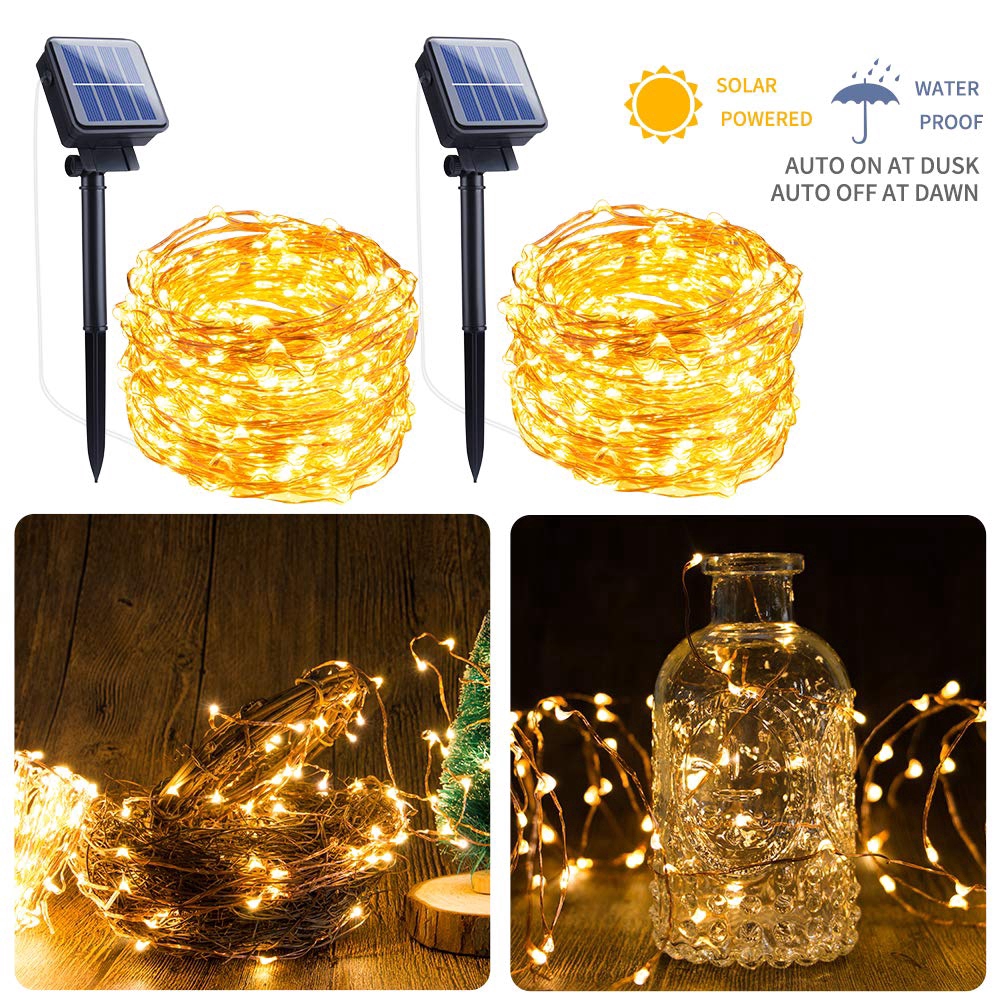 Please tear off the protective film from the solar panel before using. These lights are not fully charged upon arrival. Please put them under the sun for direct sun exposure to get fully charged. Make sure get them charged for no less than 6 hours of direct sun light during the day. Panel must be in dark/ dim environment to turn on the lights. The light will turn on automatically when the environment brightness is less than 10 Lux. (if you want to turn on it at brighter environment, please simply cover the solar panel after power is charged.) When you want to charge the string lights, please make sure it’s on status. Then it will be charged automatically. Package Includes: