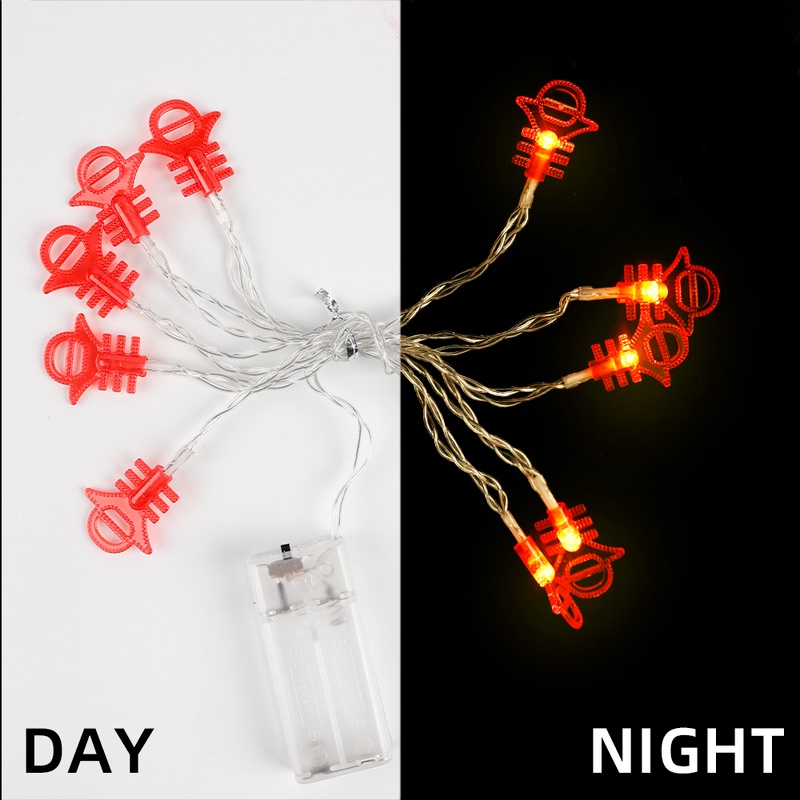 Specification Material: ABS+full copper wire+plastic Size: 1.5 meters in length color: red Modeling: Chinese knot, lantern, blessing character, spring character, double fish Number of LEDs: 10 lights Input voltage: 5V Power supply mode: battery box (2 AA batteries, not included) Uses: wedding, holiday decoration, shop decoration Applicable festivals: Spring Festival, Lantern Festival quantity: 1