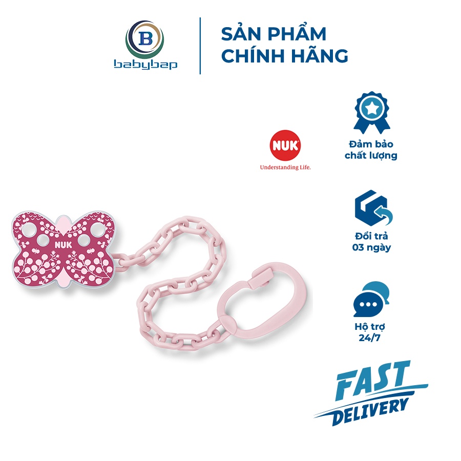 Thu ngắn dây nếu cần thiết. Tuyệt đối không quấn dây vào cổ tay, qua cổ hay cho dây ra đằng sau lưng bé, chỉ để phía trước ngực với độ dài vừa đủ. Nếu bé đánh rơi dây đeo xuống đất, hãy rửa lại với nước rửa bình NUK, tiệt trùng bằng nước nóng trước khi cho bé dùng lại. Không luộc, sử dụng trong máy tiệt trùng/ lò vi sóng/ máy rửa bát. Bảo quản nơi khô thoáng. --------------------------- ▶ Cam kết: - Sản phẩm 100% giống mô tả. - Tất cả hàng hoá đều có nguồn gốc xuất xứ rõ ràng, minh bạch, chính hãng từ các nhà sản xuất và các nhà nhập khẩu. - Hàng hoá bán ra được bảo hành theo tiêu chuẩn của nhà sản xuất. - Nếu sản phẩm xảy ra tình trạng gãy hỏng, vỡ do lỗi từ phía nhà cung cấp, khách hàng hoàn toàn có thể đổi trả. Hãy liên hệ với chúng tôi trước khi thực hiện hoàn trả hàng. TRƯỚC KHI ĐÁNH GIÁ DƯỚI 5 SAO, QUÝ KHÁCH HÀNG VUI LÒNG LIÊN HỆ SHOP ĐỂ ĐƯỢC HỖ TRỢ GIẢI QUYẾT CÁC VẤN ĐỀ.