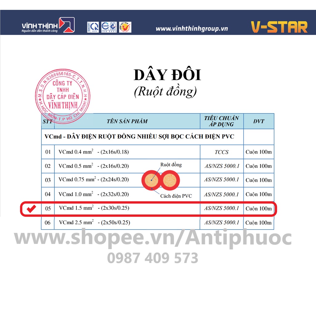 Sản phẩm dây điện đôi 1 lớp vỏ STAR Vĩnh Thịnh . Sản phẩm chính hãng - ruột đồng đủ tiết diện 1.5 mm2 .