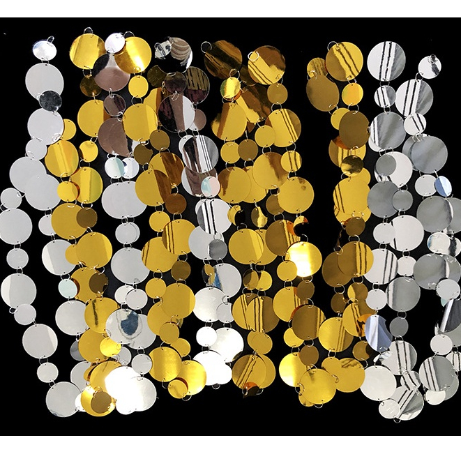 THÔNG TIN SẢN PHẨM Dây sequin hạt làm rèm trang trí nền đám cưới, trần sân khấu, cửa hàng cửa sổ trang trí gian hàng - Dây dài 1m - Sequin tròn đường kính 5cm và 3cm - Màu sắc: bạc - vàng - champaign - đỏ - Giá cho 1 dây