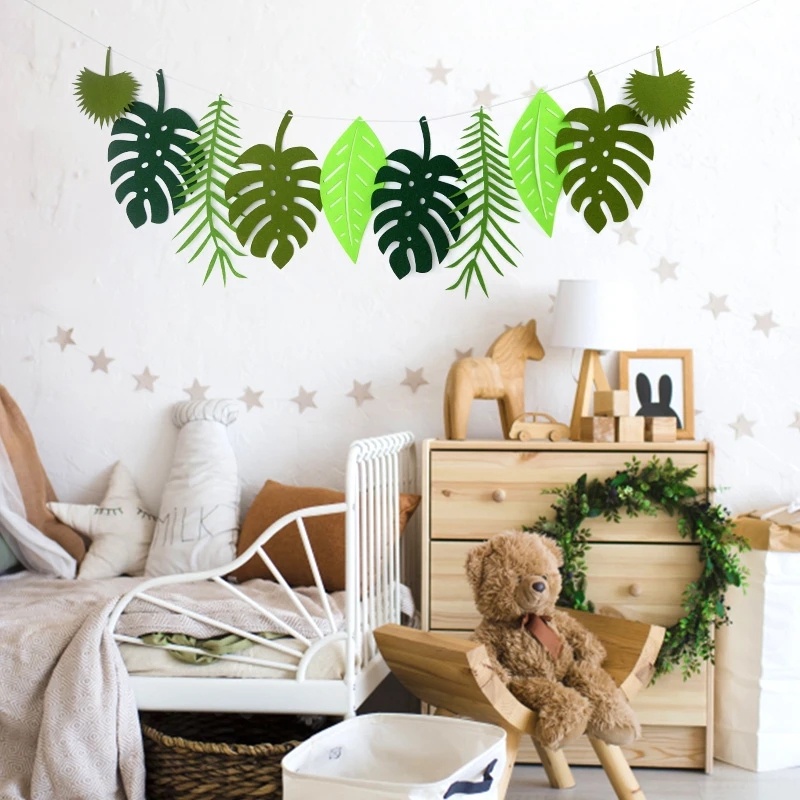 Đặc điểm kỹ thuật Danh mục “ Lá cây và cờ nỉ Chất liệu vải dệt nỉ ( không thấm nước) Kích thước “ Chiều dài dây 2,5m. kích thước 13-30cm Màu xanh lá cây Các tình huống áp dụng - đám cưới và lễ đính hôn , lễ rửa tội. tiệc tùng , kỷ niệm , đám cưới. ngày thiếu nhi. tiệc sinh nhật. trang trí nội thất Số lượng × 1pc Gói bao gồm ' 1 trang trí cờ kéo