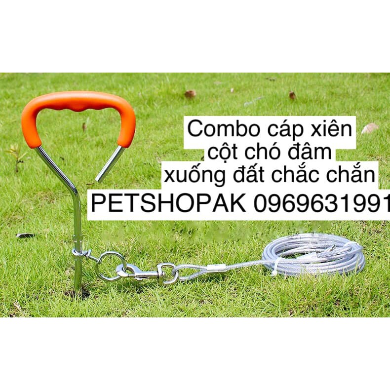 Dây xích chó bằng cáp + xiên xích cún +Xiên que để cố định dưới mặt đất. +Dây cáp loại đây 5mm để xích cún.