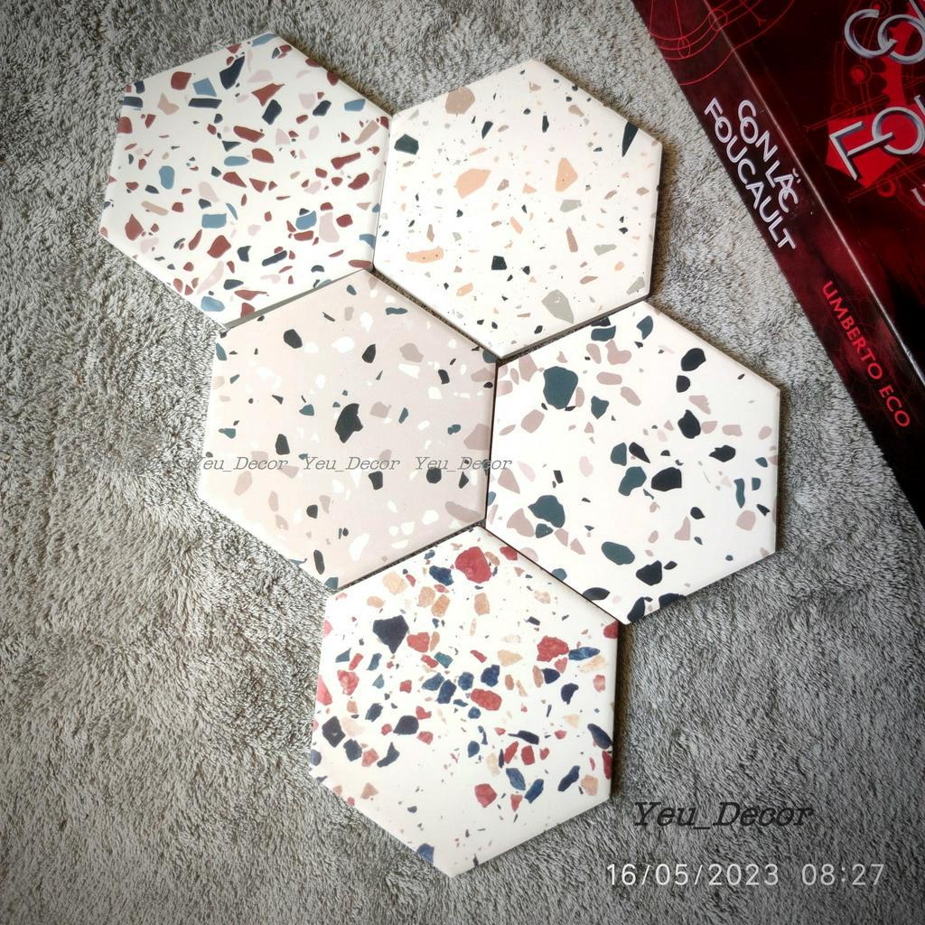 Giới thiệu Đế lót ly miếng lót cốc bằng gốm thấm hút nước hình LỤC GIÁC họa tiết VÂN ĐÁ TERRAZZO