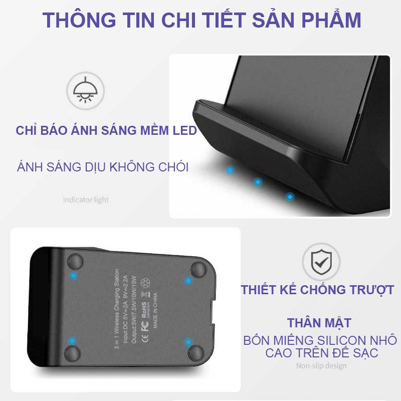 Đế Sạc Không Dây 3 Trong 1 Sạc Nhanh cho điện thoại thông minh, tai nghe không dây Android, IP
