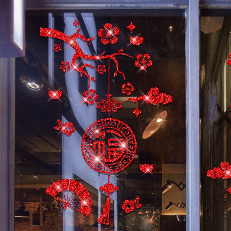 Giới thiệu Decal trang trí tết - Cành mai đỏ bảng hỷ nhũ kim tuyến Đỏ 02