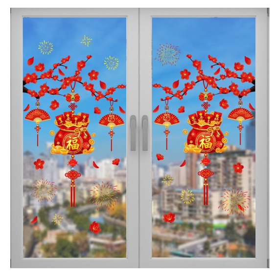 Giới thiệu Decal trang trí Tết hít tĩnh điện - Cành Mai đỏ Túi Tiền lớn vui xuân