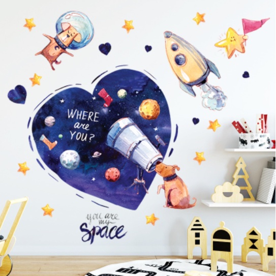 Giới thiệu Decal trang trí tường - Chú chó bay lên vũ trụ và ngồi ngắm hành tinh