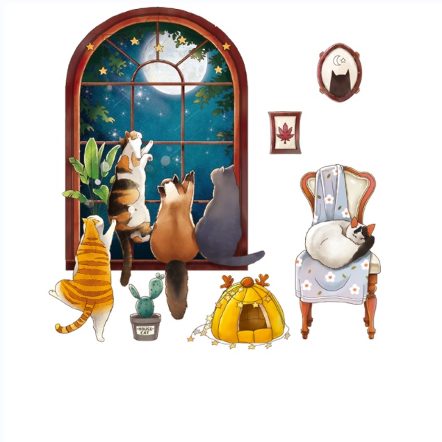 Giới thiệu Decal trang trí tường - Những chú mèo ngồi bên cửa sổ trăng