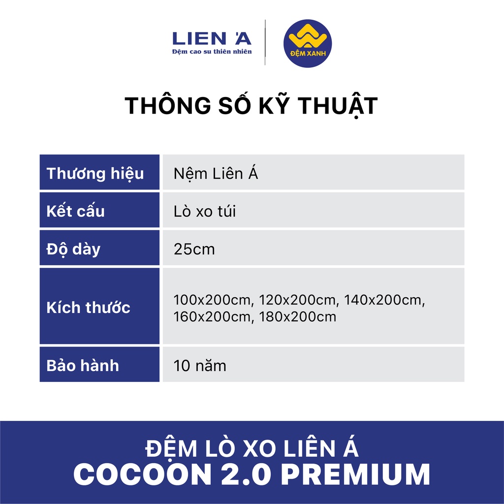 Đệm lò xo túi Liên Á COCOON GREY sử dụng hệ thống lò xo được bọc trong các túi vải riêng biệt, giảm thiểu tối đa tác động khi xoay chuyển và trở mình lên người nằm cùng, đồng thời hỗ trợ vượt bậc cho cột sống. Đặc biệt hơn, đệm COCOON GREY hỗ trợ thêm lớp cao su than hoạt tính (công nghệ C.Fusion Latex), phát huy gấp đôi khả năng kháng khuẩn và khử mùi hiệu quả, mang đến giấc ngủ lành mạnh cho bạn và cả gia đình. Đệm COCOON GREY nổi bật với thiết kế đệm gam màu xám – trắng cổ điển, dành riêng cho những ai yêu thích sự sang trọng, lịch lãm trong không gian sống của mình. Mô tả sản phẩm: Lò xo túi độc lập: Hệ thống lò xo túi với độ nâng đỡ tối ưu và không gây ảnh hưởng khi cử động đối với người nằm ngủ bên cạnh. Công nghệ C.Fusion Latex: Công nghệ dẫn truyền trực tiếp than hoạt tính vào chất liệu cao su 100% thiên nhiên, kháng khuẩn và loại bỏ các mùi không mong muốn một cách tự nhiên. Lớp nâng đỡ 100% cao su thiên nhiên: Sở hữu toàn bộ ưu điểm của chất liệu cao su thiên nhiên, đem đến giấc ngủ thoải mái, êm sâu. Hệ thống tăng cường thành đệm: Thành đệm được bổ sung thêm một lớp hỗ trợ, giúp tăng diện tích bề mặt và ngăn ngừa xẹp lún. Lớp đệm đàn hồi cao: Lớp lót đệm giữ cho cột sống ở trạng thái tự nhiên nhất, tạo sự nâng đỡ tối ưu trên toàn bộ cơ thể. Vải dệt sang trọng: Vải dệt mềm mại mang đến cảm giác dễ chịu khi ngủ Đệm được thiết kế độ dày 25cm