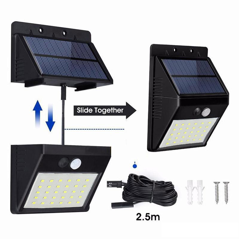 -------------------------------------------------- - -------------------------------------------------- --- Mô tả sản phẩm Chi tiết sản phẩm → 100% sản phẩm mới và chất lượng cao. → Tên sản phẩm: đèn cảm biến chuyển động sử dụng năng lượng mặt trời → Số lượng bóng đèn LED: 30 bóng LED → Màu ánh sáng: ánh sáng trắng → Nguồn năng lượng: năng lượng mặt trời → Chế độ hoạt động: 3 chế độ bằng cảm biến hồng ngoại → Thời gian sạc:> 8 giờ → Thời gian hoạt động: đầy điện, khoảng 50 lần một đêm, có thể làm việc liên tục trong 2-4 ngày → Tuổi thọ đèn: 10000 giờ → Kích thước: 129 * 94 * 46 (mm) → Khối lượng: 250g Gói hàng bao gồm → 1 x Đèn → 1 x Vít → 1 x Dây dài 2.5m → 1 x Hướng dẫn sử dụng Lưu ý → Đèn này có 3 chế độ. 1. Bấm 1 lần: Đèn sẽ sáng khi có người ở gần và tự động TẮT khi không có ai. 2. Bấm 2 lần: Đèn sẽ sáng khi có người ở gần và về chế độ SÁNG YẾU khi không có ai. 3. Nhấn 3 lần: ĐÈN sẽ LUÔN SÁNG cho đến khi không còn điện.