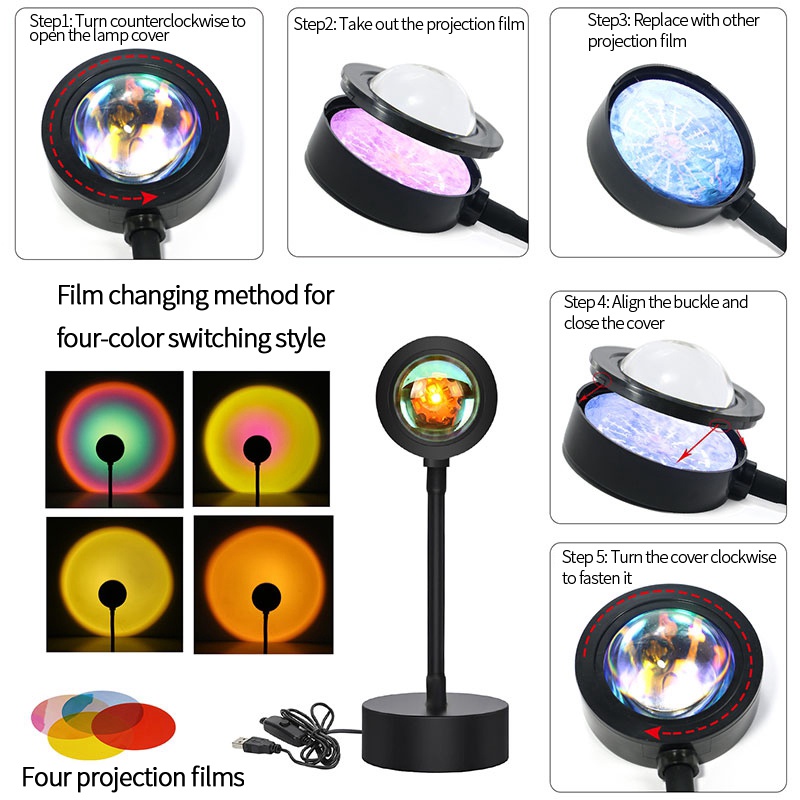 Features: 1. Made of High quality ABS shell, Simple Nordic style,adding fun to your life, safe and durable. 2. Multiple halo style options: exquisite and delicate, not dazzling, adding brilliance to the environment. 3.The beautiful sunset light line keeps your room always under the reflection of the sunset. Self-portraits and shooting will be really perfect. 4. Foldable: Metal hose is used inside the pole, which can be rotated 360 degrees and folded at will. Convenient for storage and does not take up space. 5. Many styles are available: Different kinds of beautiful lighting colors. Style#1,#2 and #3 have only one kind of light. There are 4 extra projection films of different colors will be given away in Style #4 and #5, and the color of the light can be changed by replacing the projection film. 6. Button switch on USB cable controls the power supply, and the feel is comfortable. 7. Built-in new LED bulbs,Low energy consumption, high brightness, the service life can be up to 100,000 hours. 8. Suitable Application: Bedroom,Live room, photography environment, photo wall, gifts, bars, cafes, restaurants, and all romantic places!