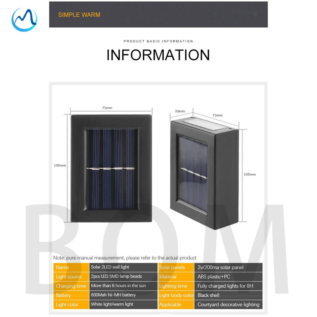 🎀Details: 📌Shell color: black 📌Light color: white. Warm White. RGB (indicating that the color is variable) 📌Solar panel power supply: 2V, 200ma 📌Built-in battery: 600 mAh rechargeable lithium battery 📌LED: 2 LEDs = 2 LED beads in a lamp. 📌Material: ABS 📌Working mode: automatic on/off + automatic charging 📌Waterproof: Yes. IP65 📌Charging time: >8 hours 📌Working time: 6-8 hours 📌Product size: about 75*30*100mm 📌Package/Net weight: approx. 100 g