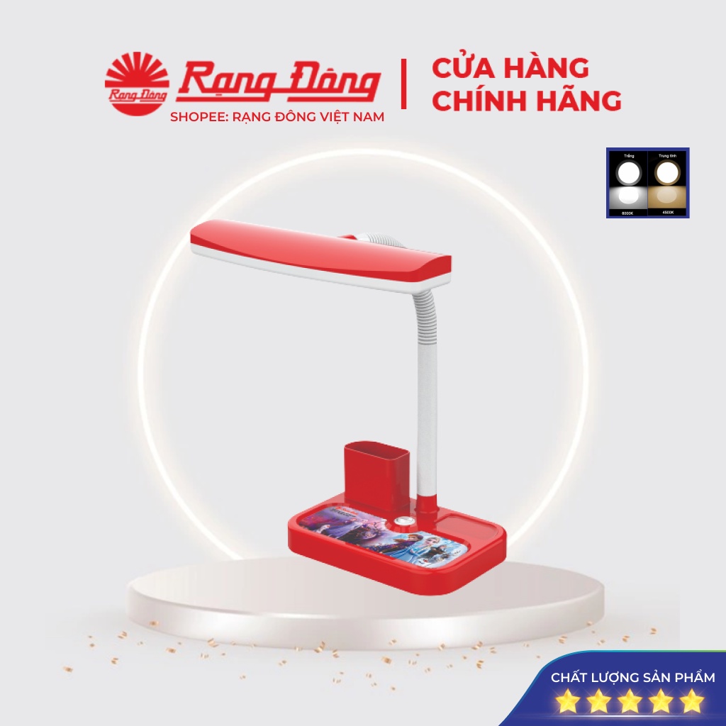Đèn học Rạng Đông 5W, đèn bàn học chống cận cho bé, học sinh, đọc sách Model RD-RL-01.V2 👉Thông số kỹ thuật: Công suất: 5W Dải điện áp: (150V - 250V)/50Hz Màu ánh sáng: Trắng/Vàng Độ rọi trên mặt bàn làm việc: 500 lux