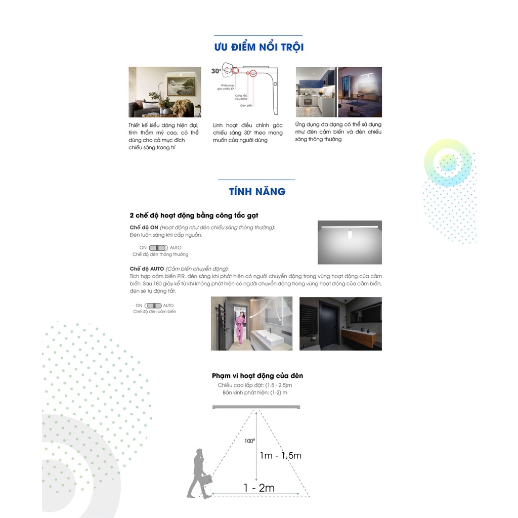 Đèn LED chiếu gương đèn gương cảm biến Rạng Đông G04.PIR 8W Công suất: 8W Dải điện áp hoạt động: 150-250V Nhiệt độ màu: 6500K/3000K Quang thông: 450/400lm Tuổi thọ: 25.000 giờ Khoảng cách phát hiện: bán kính (1-2)m Kích thước (DxRxC): (600x125x60)mm Đèn hoạt động ở 2 chế độ: Chế độ On: Đèn hoạt động ở chế độ thông thường luôn sáng sau khi được cấp nguồn Chế độ Auto: Đèn hoạt động ở chế độ cảm biến: - Đèn hoạt động dựa trên cảm biến thân nhiệt PIR do vậy đèn sẽ bật sáng khi phát hiện có người chuyển động trong vùng hoạt động cảm biến - Đèn tự động bật sáng khi phát hiện có người chuyển động trong phạm vi của cảm biến - Đèn tự động tắt sau 180s kể từ khi phát hiện không có người chuyển động trong phạm vi hoạt động của cảm biến #rangdong #cambien #denguong #ledguong #pir #8W #chieuguong