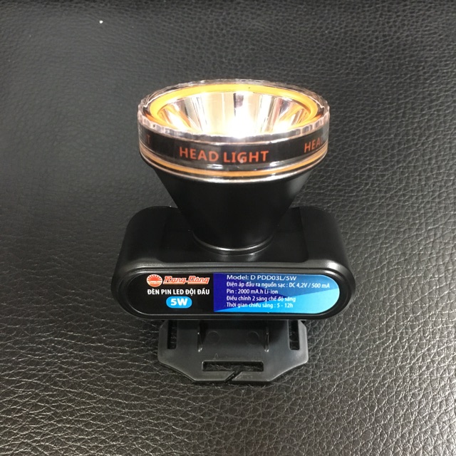 Rechargeable led headlamp 5W Brand: Rang Dong Made in Vietnam Model: D PDD03L/5W Power : 5W Bright: white 6500k or yellow 3500K Time use : 5 - 12 hours Time rechargeable: 12 hours Voltage Out : 4,2v / 500mA Voltage in : 220V/50hz Pin: Li-ion 2000 mAH