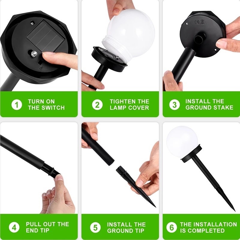 "mô Tả Bóng đèn tròn hình bãi cỏ Đèn LED ánh sáng năng lượng mặt trời Đèn cỏ ngoài trời cho vườn sân trong Nó rất dễ dàng để lắp đặt, chỉ cần cắm trực tiếp vào mặt đất Không có điện, nó có thể được sạc bằng cách hấp thụ ánh sáng mặt trời. Đèn LED có thể được sạc bằng ánh sáng mặt trời trong 4~6 giờ và có thể cung cấp ánh sáng 6~8 giờ. Không cần lo lắng về việc tiếp xúc với mưa và tuyết! Đèn có thể hoạt động bình thường trong mọi loại thời tiết, và lớp chống thấm nước là IP44