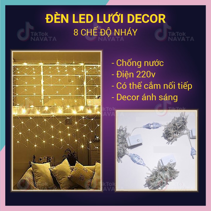 ĐẶC ĐIỂM CỦA ĐÈN LED LƯỚI CÁ: - Đèn Led dài 1,5m x 1,5m (Có thể nối liền dài ra thêm thành nhiều bộ led cộng lại). - Trang trí decor quay video tiktok kết hợp với đèn led tiktok rất đẹp tạo nên các đoạn video và hình ảnh triệu view. - Trang trí dịp lễ tết, tiệc tùng tính ứng dụng cực kỳ cao. - Led lưới cá chống nước nên bạn có thể trang trí trực tiếp ngoài trời bất chấp mưa gió nhé. - Thời gian hoạt động trên 50000h - Phích cắm 1 đầu trực tiếp vào điện 220v 1 đầu cắm cuối dây có thể cắm nối trực tiếp vào bộ led lưới cá tiếp theo