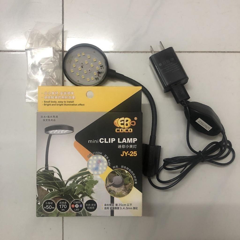 Đèn LED Mini Clip Lamp JY-25 ✔ Xuất sứ: Trung Quốc ✔ Quy cách: + 1 thân đèn, màu trắng hoặc đen + 1 adapter ; + 1 chân kẹp acrylic rộng tối đa 18mm. ✔ Đặc điểm & Công dụng: - Đèn LED Mini Clip Lamp JY-25 thiết kế nhỏ gọn và tiện lợi, kèm theo chân kẹp riêng giúp bạn có thể kẹp đươc cho nhiều loại bể cá tròn, bể mini để bàn ; - Đèn có công suất 4W, với 18 led trắng + 1 led xanh và 1 led đỏ; đủ sáng & tối ưu cho cây thuỷ sinh phát triển với hồ có kích thước từ 25cm trở lại ; ✔ Thông số: + Chiều dài đèn để thẳng: 11.5 cm + Chiều dài khi uốn cong: 10.5 cm + Đường kính đèn: 5 cm + Kiểu dáng: dạng kẹp thành hồ cá có khe kẹp 18mm tích hợp 2 in 1 kẹp bể tròn hoặc bể kính 5 li. + Nguồn điện: cổng USB 5V, có adapter đi kèm ; + Công suất: 4W